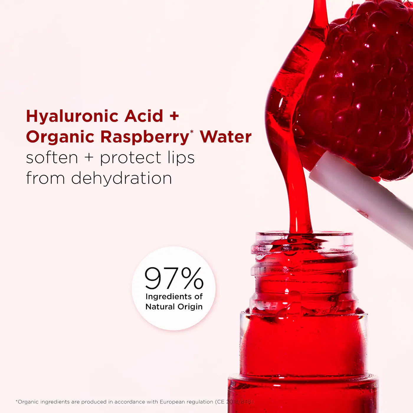 - Complejo de ácido hialurónico y agua orgánica de frambuesa: suavizan y protegen de la deshidratación para que los labios se sientan cómodos y flexibles.